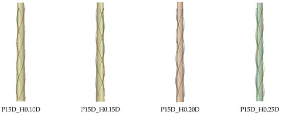In this section, the pitch P = 15 D is taken as the invariant, and the spiral side plate height H is changed from 0.10 D to 0.25 D, as shown in Figure 23. The different spiral side plate height conditions in the comparison include the following: 0.10 D, 0.15 D, 0.20 D and 0.25 D. Similarly, to facilitate the identification of pitch in the following analysis, the following symbols are used: P15D_H0.10D, P15D_H0.15D, P15D_H0.20D and P15D_H0.25D. Among them, the structural form P15D_H0.10D is the same as the abovementioned structural form H0.1D_P15D.