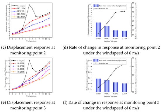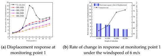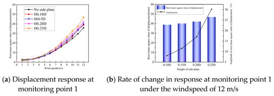 The root mean square values of the along-wind displacement response at the monitoring points of the high light pole structure under different windspeeds and different side plate height conditions are shown in Figure 25.