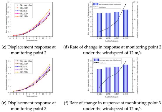 In Figure 25, we can clearly see that the along-wind root mean square displacement response of the light pole under different side plate height conditions expresses rather similar trends. In general, for the case in which the pitch is equal, the along-wind vibration responses of the structure continue to improve with increasing side plate height. When the incoming windspeed reaches 12 m/s, the root mean square value of the along-wind displacement of the pole without side plates reaches its maximum value. Similar to Figure 19, under the same windspeed of 12 m/s, the rate of change in responses at different monitoring points has varying degrees of increase.