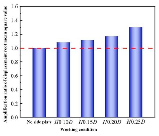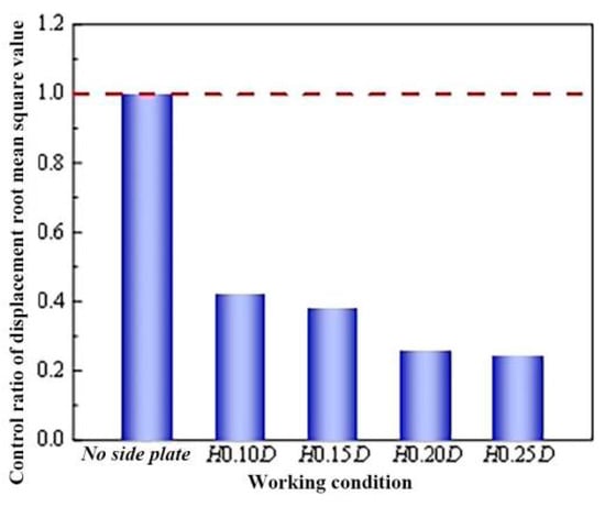Similarly, when the windspeed is 12 m/s, the comparison of the amplification ratio of the along-wind displacement response of the light pole under different side plate height conditions is shown in Figure 27. For the crosswind displacement of the light pole, when the windspeed is 6 m/s, the comparison of the control ratio of the crosswind displacement response of the light pole under different side plate height conditions is demonstrated in Figure 28. The red line shown in Figure 27 and Figure 28 has the same meaning as that shown in Figure 21 and Figure 22, respectively.