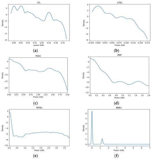 Power distribution through KDE plots for appliance label (a) LTL; (b) LTB1; (c) PGB1; (d) PMP; (e) WTB1; and (f) ANB1.