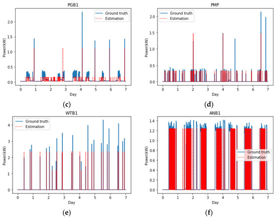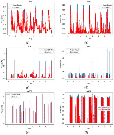 The lighting, plugging, and the water heater loads, which obtained relatively low power estimation accuracy values, had relevant results to the power plot profiles. For example, the plot showed several false positives for LTL and LTB1 labels, which made the performance value quite low, while PGB1 and WTB1 labels had a considerable gap between the ground truth and the estimated power data due to the fluctuation of the actual power data.