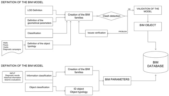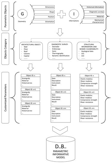 The lack of regularity and standardization that characterizes the historic building makes the modeling and parameterization phase particularly challenging. The parametric objects, however, are an aid to the modeling phase because of the possibility of defining those parameters several times, setting values for each case that allow the adaptation to each specific situation. The H-BIM approach allows the creation of personalized parametric objects characterized by a geometric component capable of providing information related to the shape, size and positioning of the object itself in the 3D space and in relation to the other elements, and an informative component capable of including heterogeneous information. In the case of existing constructions, we can refer to the historical period in which the element was originated, and apply this to data concerning the diagnostic phases and their results, the adopted materials, the stratigraphies and the mechanical characteristics of the elements investigated.