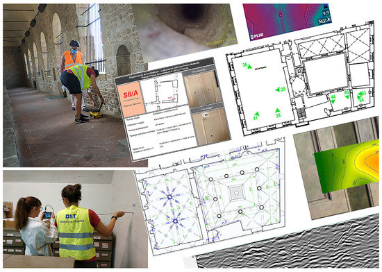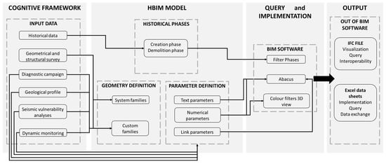 The conservation and maintenance of Cultural Heritage Buildings (CHBs) represents one of the main objectives of contemporary societies. Because of their documental, historical, and artistic values, CHBs needs to be safeguarded towards the different risks affecting their standing [1,2]. Referring to CHBs, the issues dealing with the risk mitigation go in parallel with problems concerning the conservation and the applications of compatible non-invasive approaches. The latter refer to: (i) the diagnostic acquisition during the investigation campaigns, and (ii) the adoption of compatible, removable interventions during the retrofitting phases [3,4,5,6,7,8]. The second step does not always represent a required next level, since the decision is made on the level of risk affecting the asset, as to the invasiveness of the retrofitting solutions. In the conservation of CHBs, today’s informative systems include state-of-art models [9,10,11]. Although the BIM workflows applied to the historic buildings (H-BIM) are mostly targeted at documenting the current situation of the buildings, researchers conceived methodological flowcharts where the informative model was the receptacle of the inputs, but also the system for the outputs required for other type of analysis [10,12,13,14]. In this context, the informative model becomes central to the procedure, within input-output data management. Dealing with H-BIM approaches where the model contains heritage information, different studies have been carried out in recent years [11,15,16].