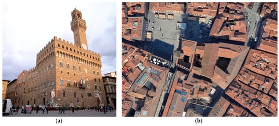 Palazzo Vecchio is one of the most famous monuments of Firenze (Italy). It is located in Piazza della Signoria, an historical area located at the southern boundary of the first Roman city in the territory. The site where Palazzo Vecchio stands is an extremely rich place from historical-archaeological perspective; the present-day street datum is about 6 m above the Roman street datum [44,45,46]. During the Roman period, when the city of Florence was founded, the area of Palazzo Vecchio was located outside the town walls, close to the south-west corner of the original castrum [47]. Here, a Roman theater existed for several centuries, and its traces are still visible in the underground level of Palazzo Vecchio. The building founds its origins in the early fourteenth century, when the famous architect Arnolfo di Cambio built the first nucleus of the palace as the seat of the city government. Through different historical moments and political successions, the building has maintained its political vocation over the centuries. Palazzo Vecchio is actually the seat of the Municipality of Florence, which counts over 382,000 inhabitants and it is the administrative center of a metropolitan area of 1 million citizens. For its history and unicity, Palazzo Vecchio is included within the CHBs of the city; as the entire historic center of Firenze, the structure has been under UNESCO patronage since 1982. Many authors dealt with the historical evolution of Palazzo Vecchio, which is constituted by several structural units erected during the centuries [48,49,50,51,52,53,54,55,56,57,58]. A view of the main façade of the palace and an urban overview are shown in Figure 4.