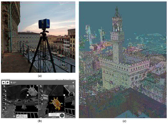 The point cloud from LST survey; (a) in-situ acquisitions; (b) internal point cloud reconstruction; (c) global point cloud of Palazzo Vecchio.