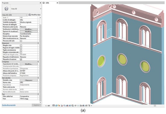 Interoperability and collaboration between different disciplines may be guaranteed by exporting in IFC format, although there are current limits of this standard with respect to the information collected in H-BIM [43]. Exporting the IFC model allows viewing and querying in an open format. The management of the parameters in customized presets allows consultation of the model without using the proprietary format.