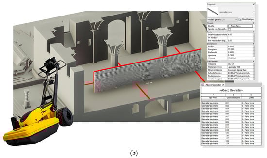 Therefore, working on the chosen categories and using shared parameters, at the level of family or types the parameters corresponding to characteristics common to a single type of survey were specified. The parameters assigned to the individual object (instance) are those that are specific to the individual survey. The choice of parameters to be inserted followed a logic that would allow an easy reading according to the rule of “what, where, how, when”. The investigated objects have therefore been associated with parameters that allow the user to enter information such as the date of execution, the description, the tool used and the results. In some types of investigations, for example GPR surveys, it was possible to create objects hosting the diagrams resulting from the instrumental processing in order to have a perfect correspondence between the geometry of the investigated element and any anomalies found. The advantage of this digitization procedure lies that it allows the exact geometric location of each investigation, permitting the identification of anomalies or structural discontinuities in relation to the context in which the survey was carried out.