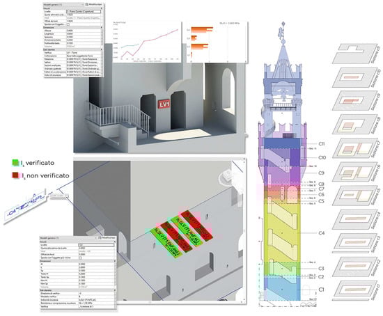 In Figure 11, examples of the process of cataloging data into the H-BIM of Palazzo dei Priori are shown. The objects representing the Safety Index are editable labels. The figure shows two parameterized texts: the first shows the name of the verification index relating to the aforementioned assumptions on the compressive strength. The material changes its colour based on the two conditions: Is < 1 and Is ≥ 1. The family also contains the parameters relating to the verification direction and the chosen model. The digitalization process is ready to be implemented with the following results coming from the kinematic assessments or global numerical evaluations.