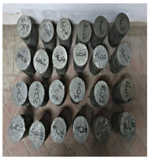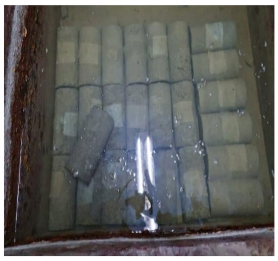 The final cylindrical samples were created in accordance with the ASTM C31 standard []. The mold was cylindrical, with a length and diameter of 8 inches and 4 inches, respectively. Three layers of the concrete mixture were pounded and squeezed into the mold (Figure 6). The samples (Figure 5) were removed from the mold after 24 h and maintained for 28 days to cure (Figure 7). After fixation, various mechanical tests were performed to determine the mechanical properties of the samples after 28 days. Three additional tests—water absorption, compression, and split tensile strength—were performed, and the durability and strength of the composite blocks were identified.