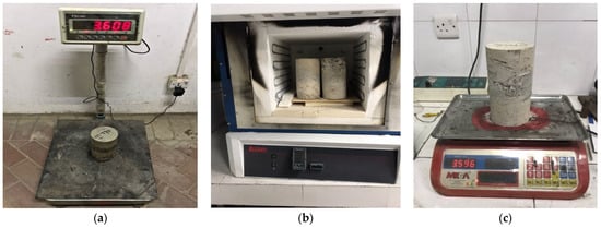 Weight measurements of the dry and wet samples: (a) wet condition weight, (b) drying process, and (c) dry condition weight.