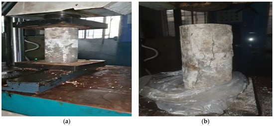 At first, the flat surfaces of the specimen were placed in the machine in such a manner that the load was applied to the opposite sides of the cylinder cast, as shown in Figure 9. The pressure was increased gradually with respect to time until the failure of the sample appeared to find the maximum load. Equation (2) was used to determine the compression strength of the specimens.