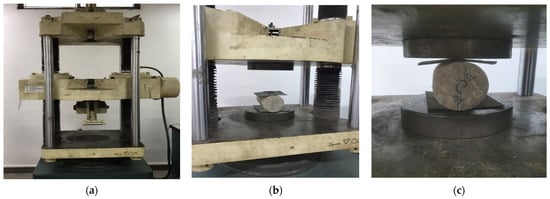 Experimental setup for split tensile test of the cylindrical samples: (a) UTM for tensile splitting strength, (b) placement of the specimen in UTM, and (c) specimen after failing under tensile splitting strength.