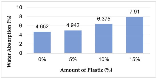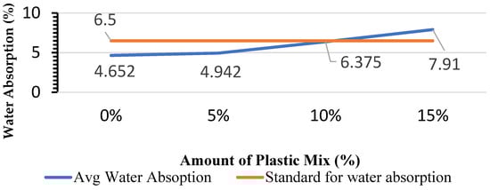 The experimental water-absorption rate is shown in Figure 17 to compare with the ASTM C39 standard [] water-absorption rate of the concrete structure. Though the water absorption rate rises in concrete with the mixture of SP aggregate, the ASTM standard suggests that the 0–10% SP aggregates in concrete might be useful. Beyond this limit of SP mix, excessive inclusions or porosity in concrete might cause concrete failure, and the mechanical strength of the concrete will be adversely affected. Other than that, the 15% plastic mix shows a higher rate of water absorption, and more water absorption reduces the workability of the concrete.