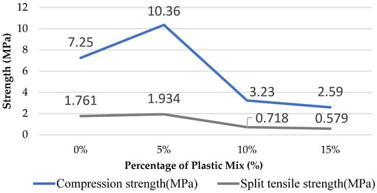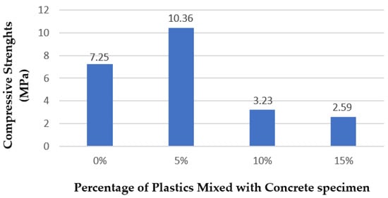 In this experiment, the compressive strengths were 7.25 MPa for 0 SP mix, 10.4 MPa for 5% SP mix, 3.25 MPa for 10% SP mix, and 2.6 MPa for 15% SP mix found. Therefore, based on the finding above and an average of the results for various SP mix ratios, the 5% plastic replacement with coarse aggregate exhibits higher compressive strength.