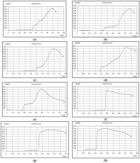 Load–time curve for different cylindrical specimens from the compressive tests in a UTM with sample ID of (a) B0, (b) D0, (c) C5, (d) D5, (e) B10, (f) C10, (g) C15, and (h) D15.