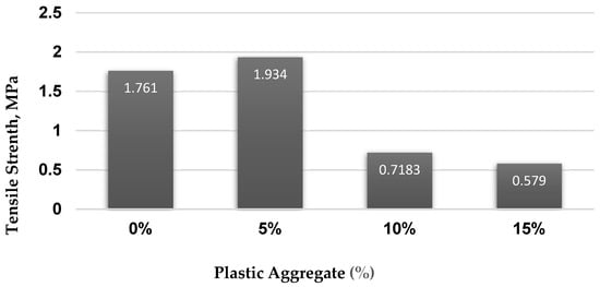 Table 5 shows the split tensile loads and the ultimate tensile strengths up to the failure of the specimens found in the split tensile test. It is seen that the ultimate tensile strength decreases with the addition of plastics (PP) to replace the coarse aggregate in concrete after a 5% mix of SP. It is also clear from Figure 15 that the maximum tensile strength (1.934 MPa) was for the sample of 5% SP mix with the concrete. This might be caused due to the poor bonding between the plastic’s surface and the cement’s binder at a higher percentage of plastics. To avoid this failure, it is suggested to optimize the usage of plastic concentrations in the concrete mix.