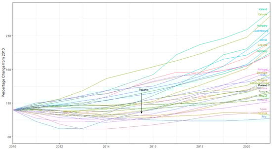 Figure 2 shows the percentage change in average apartment/house prices over 2010–2021 in various European countries. In Poland, prices have increased by 39.92% in this period (i.e., in these 11 years). However, as