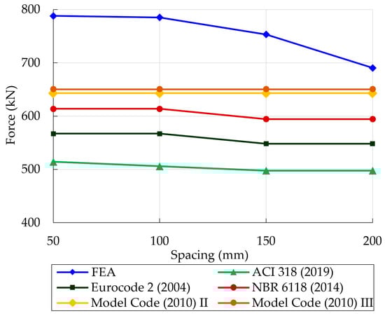 - Series A: in general, the rules worked in favor of safety. Note that the design codes did not show a significant parameter capable of interfering with the results when changing the spacing between the tendons. It was identified that the fib model code [14] presents the best estimates even in the LoA III approximation, where the code considers that this level is not suitable for estimating cracked elements. ACI [11] was the most conservative in the estimates.