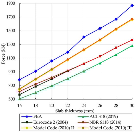 - Series T: it was observed that the fib model code [14] has the best trend of results as the thickness of the slab is increased; additionally, there is little difference in the results in its two levels of approximation. In general, the other standards tend to show the same behavior, except for ACI [11], which is characterized by more conservative behavior in estimates.