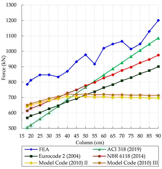- Series C: the predictions of Eurocode 2 [12] and NBR [13] follow the same trend of behavior, differing due to the scale factor k. Considering the coefficient of variation and the average, the best results were due to NBR [13], followed by ACI [11]. In the case of the ACI [11], better predictions were noted with the increase in the rectangularity of the column. For the fib model code [14], it is observed that, in levels II and III, there is a stability of the results from the C-40 Series, which is justified due to the discontinuity of the critical perimeter, limited to 3d.
