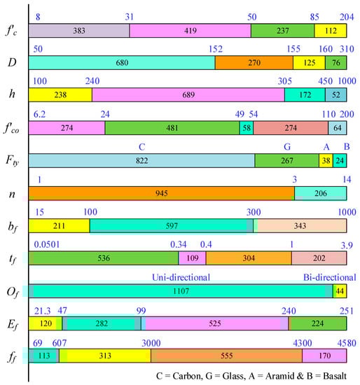 ranges between 8 to 204 MPa with 49.37 MPa as an average value. D and h of the cylinders range from 50 mm to 310 mm and 100 mm to 1000 mm with a mean value of 142.9 mm and 294.15 mm, respectively. ranges from 6.2 MPa to 200 MPa with 49.32 MPa as a mean value. used in the study are carbon, glass, aramid, and basalt with their ranges from 21.3 GPa to 251 GPa and ranges from 69 MPa to 4580 MPa. Moreover, CFRP is wrapped on 822 cylindrical specimens while glass-FRP (GFRP), aramid-FRP (AFRP), and basalt-FRP (BFRP) are applied on 267, 38, and 24 cylindrical specimens, respectively.