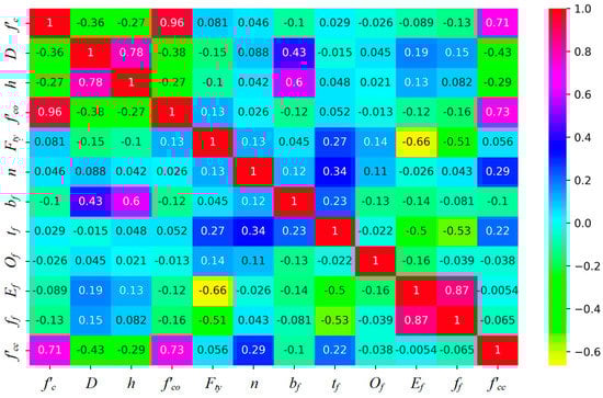 From an extensive study of published literature on the FRP-confined concrete cylinders, an experimental database of 1151 specimens was collected [,,,,,,,,,,,,,,,,,,,,,,,,,,,,,,,,,,,,,,,,,,,]. Input parameters considered in this study are the diameter of the cylindrical specimen , the height of the cylindrical specimen , concrete grade , FRP type , orientation of FRP , unconfined CS of the concrete cylinder , FRP width ( and thickness (, modulus of elasticity of FRP (, FRP tensile strength , and number of FRP layers (. The FRP-confined CS is taken as the output .