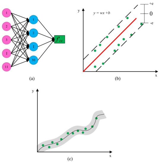 Architecture of ML models (a) ANN, (b) GPR, (c) SVM.