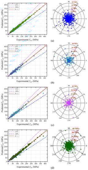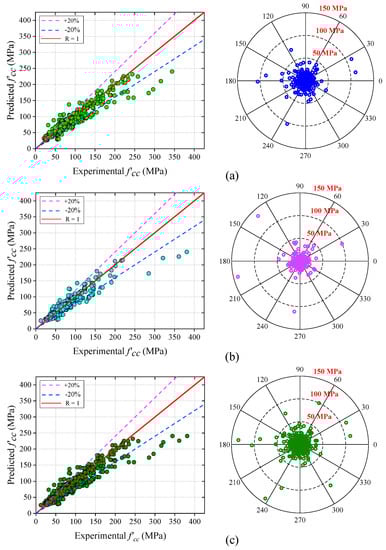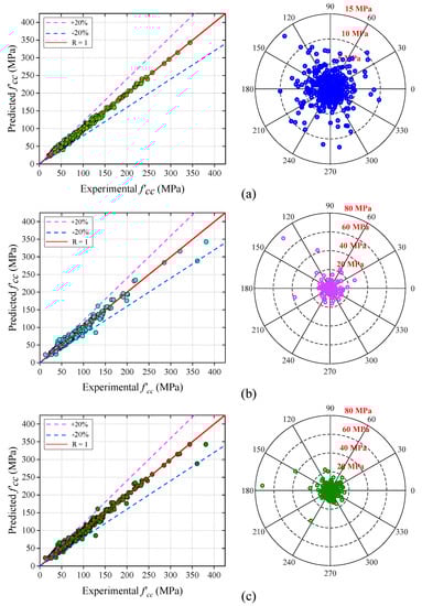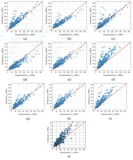 The outcomes of the confined CS of each model are presented in Figure 7, which depicts a scatter diagram between the measured and predicted CS of the FRP-confined concrete cylinders. The results provided in Figure 7 illustrate that the data points in the best-predicted model are uniformly concentrated on the best fitted line and show superior accuracy. According to this figure, the data points in the model of Wu and Wei [] are lying above the diagonal line, which indicates that the model overestimates the confined CS of the cylinder. However, a good proportion of the data points in the models of Pham and Hadi [] and Youssef et al. [] are evenly scattered on both sides of the straight line. It has been observed that almost all the data points in the model of Kumutha et al. [] are lying beneath the diagonal line, demonstrating that the model underestimates the confined CS of the FRP-confined concrete cylinders, whereas, in the models of Samaan et al. [] and Toutanji [], a good proportion of the data points are scattered above the diagonal line, signifying that the models overestimate the CS of the FRP-confined concrete cylinders. It has also been witnessed that most of the data points in the model of Wei and Wu [] are uniformly distributed along the best fitted line, indicating good accuracy of the model.