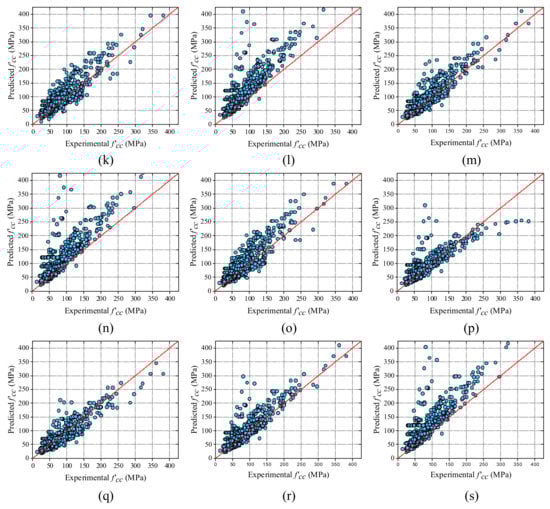 Scatter plot of analytical models; (a) Wu and Wei [], (b) Pham and Hadi [], (c) Youssef et al. [], (d) Kumutha et al. [], (e) Samaan et al. [], (f) Toutanji [], (g) Wei and Wu [], (h) Saafi et al. [], (i) Teng et al. [], (j) Mander et al. [], (k) Spoelstra and Monti [], (l) Mark and Sofi [], (m) Karbhari and Gao [], (n) Lam and Teng [], (o) Cusson and Paultre [], (p) Liang et al. [], (q) Benzaid et al. [], (r) Al-Salloum [], and (s) Qazi et al. [].