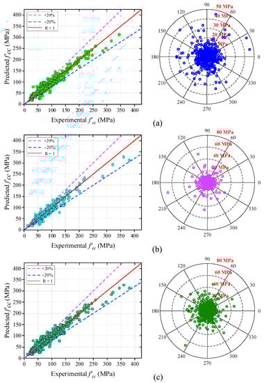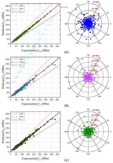In the optimized GPR model, the R-values are observed to be 0.9982, 0.9916, and 0.9960 for the training, testing, and whole datasets, respectively, whereas the MAE, MAPE, and RMSE values are found to be 1.57 MPa, 2.28%, and 2.48 MPa for the training set; 3.59 MPa, 5.04%, and 5.99 MPa for the testing set; and 2.18 MPa, 3.11%, and 3.88 MPa for the whole dataset, sequentially. The NS and a20-index values of the SVM model are 0.9966 and 0.9962 for the training set, respectively. The scatter plot of the optimized GPR model in Figure 11 indicates that all the data points are concentrated and uniformly distributed across the diagonal line in the training set, which demonstrates that the model is best fitted and acquired the best accuracy.