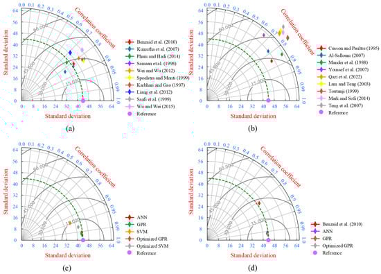 The implementation of the ML algorithms (ANN, GPR, SVM, optimized GPR, and optimized SVM) on 1151 cylindrical specimens is presented and discussed in this section. The performance of these algorithms is measured using six different metrics, i.e., R, MAE, a20-index, RMSE, NS, and MAPE. The outcomes of the suggested analytical models are displayed and described with the help of a scatter plot, a violin plot of error distribution, and a Taylor diagram.