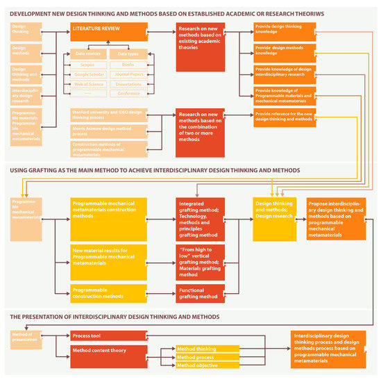 - Above all, according to the concepts, methods, and theories that are involved and need to be clarified, this research will systematically use the method of literature review to provide the required theoretical basis for the research. Relevant knowledge comes from Scopus, Google Scholar, and Web of Science databases, involving monographs, scientific articles, dissertations, and conference papers. Specifically, firstly, by sorting out the knowledge of design thinking and design methods, the definitions, concepts, and interrelationships of specific research objects are clarified. Secondly, by sorting out the research situation of interdisciplinary design thinking and methods, clarify the current mode of interdisciplinary design and multidisciplinary cooperation, and provide ideas and models for interdisciplinary design research for this study. At the same time, these cases can also demonstrate the necessity and rationality of this research. Thirdly, by combing the cooperation status of programmable materials and design to provide more specific research ideas and model references for this study. Fourthly, by combing the relevant situation of programmable materials and mechanical metamaterials to provide the definition, concept, and methods of interdisciplinary research objects for this study.