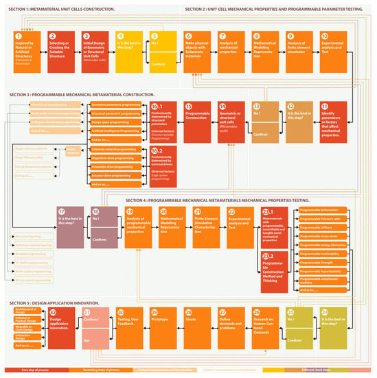 - Steps 14–15: Implement programmable construction based on unit cells. Based on unit cells, unit cells tessellation (results from Section 1), relationships between unit cell geometry or structural parameters and mechanical properties of materials, or relationships between smart materials and mechanical properties of materials (results from Section 2), designers can achieve the programmable construction of metamaterials. The construction method consists of construction elements and construction strategies.