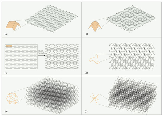 - Step 1: Nature or artificial structure inspiration. Nature or artificial structures are rich in types. It is the most important source of inspiration for geometric or structural unit cell design, which can provide a wealth of reference for the design of the unit cell. Origami geometry or structures [191], kirigami geometry or structures [168], lattice geometry or structures [192], tensioned monolithic structures [193], and layered structures are common sources of geometry or structures. Typical origami geometry or structures, for example, Miura Origami Structure (Figure 10a) and Eggbox Origami Structure (Figure 10b); Typical kirigami structures, for example, stretched kirigami structures (Figure 10c); Typical lattice structures, for example, Triangular 2D lattice structures with sinusoidally curved beams (Figure 10d), Cuboctahedron lattice structures (Figure 10e), and Body-centered cubic(bcc) lattice structures (Figure 10f).