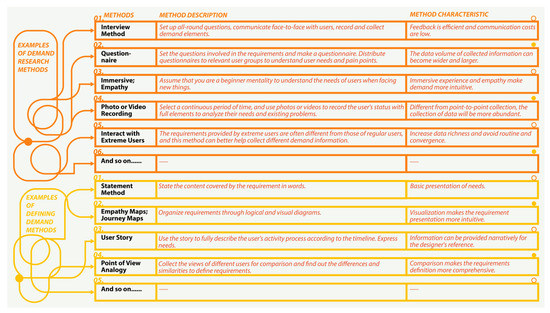 - Steps 26–27: Demands research and definition. Empathy and insight are fundamental approaches to demands for research and definition. Under their guidance, the methods for realizing demands collection and definition are shown in Figure 14. In addition, the status of demands in the entire design method process model needs to be emphasized again: First, under the guidance of the design non-linear thinking, demands can be the first step in the overall design method process model. Starting from the definition of the demands, unit cells and programmable mechanical metamaterials are designed based on the demands, and the design applications are generated to meet the demands. Secondly, according to the thinking of driving design innovation with material innovation, the demand can also be placed later. After constructing the programmable mechanical metamaterials, the designer matches the demands to the programmable mechanical properties and thus conducts the design innovation research.