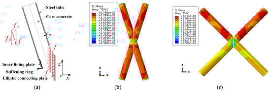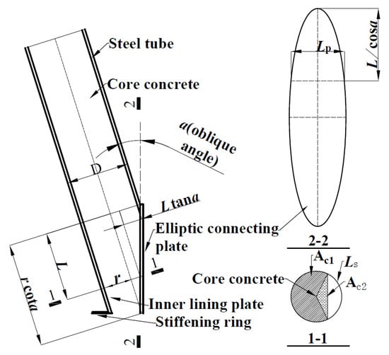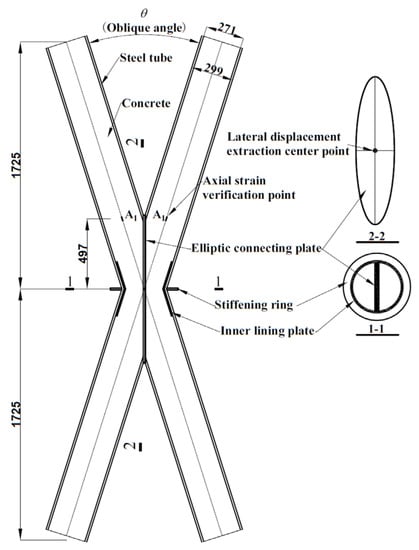 The structural system of a concrete-filled steel tube (CFST) with oblique grid nodes proposed by Huang is adopted []. The structural form is composed of concrete-filled steel tubular columns intersecting at a certain angle in the plane. The main connecting and restraining members are the elliptical connecting plate, reinforcing ring, and lining plate. The connection mode for steel members is welding, as shown in Figure 1.