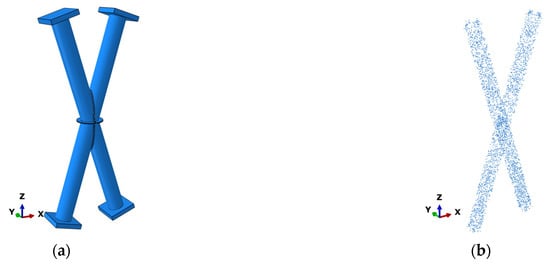 Smooth flat steel fiber is established by the truss element, and the cross-sectional area of the steel fiber is input into the section definition. The interaction between steel fiber and concrete is the embedded region. Python script is used to set the number of steel fibers and random spatial distribution, as shown in Figure 2b. Specific mechanical parameters are shown in Table 1. In view of the fact that the concrete-filled steel tube member is prone to buckling damage near the bottom of the column in the test, grid encryption is carried out on the 450 mm area of the bottom of the steel tube. Because there exists a cohesive slip between steel pipe and concrete in the tangential direction, a cohesive element is used to simulate the cohesive slip effect, and a hard contact is used in the normal direction to prevent the penetration of the element. In the actual situation, the two steel pipe columns on the same side of the connecting plate are welded by groove, and the nodes are welded by lining pipe with the upper and lower oblique grid columns. Therefore, the contact between all steel parts is set as a tie constraint in the model. The axial pressure displacement along the axis of the steel tube is applied to the top of the steel tube, and the reference points are established for the steel tube and the core concrete to extract the load–displacement curves, respectively. The bottom end of the steel pipe is completely fixed by ENCASTRE. Component failure can be considered when local buckling or large lateral deformation occurs.