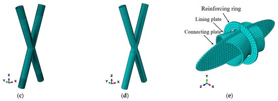 In existing studies, steel components of the finite element model of an oblique grid, such as steel pipe, a reinforcing ring, and an elliptical connecting plate, are built by shell elements. The applicable conditions for shell elements [] are as follows: The one-dimensional (thickness) dimension is much smaller than the other two-dimensional dimensions, and the deformation perpendicular to the thickness direction can be ignored. Steel parts such as reinforcing rings and elliptical node plates do not meet the above conditions, and the deformation in the thickness direction is also the focus of the research, so this modeling method has certain limitations. The loads and members are symmetrical, so Abaqus finite element analysis software is used to establish a three-dimensional solid model (C3D8R). To ensure the accuracy of the model calculation results, structural mesh technology is used to divide the models into grids. See Figure 2c–e.