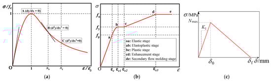 Steel pipe is generally made of low-carbon steel. As an elastic–plastic material, von Mises’ yield criterion strength theory is adopted []. The five-segment quadratic plastic flow model should be adopted for the constitutive relationship, as shown in Equations (9)–(12) and Figure 3b.