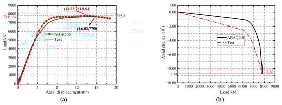 Components in the literature [] are selected for verification. The detailed dimensions of the components are shown in Figure 1. The oblique angle is 35°, and the concrete strength grade is C60. Figure 4a shows the comparison between the test curve and the finite element curve. In the load–displacement curve, the axial displacement is the displacement of the top end of the steel pipe along the axial direction of the steel pipe. As can be seen from the figure, the evolution law between the load–displacement curve of the test and the finite element model is similar. The initial stiffness of the curve is almost the same, but the stiffness of the test curve is slightly larger, and the stiffness of the curve decreases when the load is about 5000 kN. The main reason for the fluctuation of this stiffness is that the concrete in the actual situation is heterogeneous, and there may be a few cracks and holes. However, the stiffness of the elastic section of the finite element model is almost a straight line, which is different from the actual situation. The concrete in the model is a three-dimensional homogeneous entity, which causes this difference. However, the ratio of the finite element model limit load to the test limit load is 1.0782, with a small difference. However, the displacement corresponding to the test limit load is slightly larger.