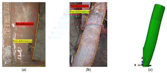 Comparison of failure modes between finite element model and test component: (a) bulging damage of steel pipe in node area, (b) bending failure, and (c) failure pattern of FEM.