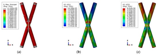 Figure 6 shows the nephogram of related parameters for components. From the figure, it can be seen that most areas of concrete are under three-dimensional compression, especially the compressive stress in the node area, which reaches the maximum value, indicating that the concrete in the node area is well constrained by the reinforcing ring, the inner lining plate, and the connecting plate. After the concrete is subjected to a large pressure load, it expands circumferentially. Because of the hoop effect of the steel pipe, the hoop strain of the steel pipe in the node area is positive, and the axial strain is negative, as shown in Equations (14) and (15): is 1/2 oblique angle, LEh is hoop strain, and LEz is axial strain. The steel pipe is under axial compression and circumferential tension. It shows the good performance of restrained concrete.