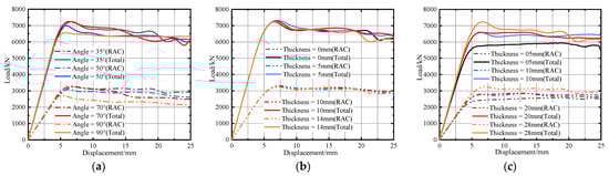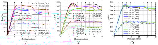 Load–displacement curve: (a) oblique angle, (b) thickness of reinforcing ring, (c) thickness of connecting plate, (d) concrete strength, (e) recycled aggregate replacement rate, and (f) fiber content.