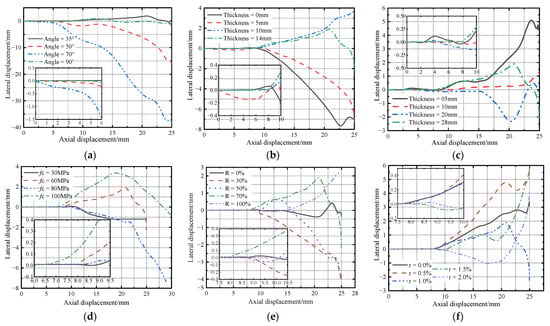 Axial displacement–lateral displacement curve: (a) oblique angle, (b) thickness of reinforcing ring, (c) thickness of connecting plate, (d) concrete strength, (e) recycled aggregate replacement rate, and (f) fiber content.