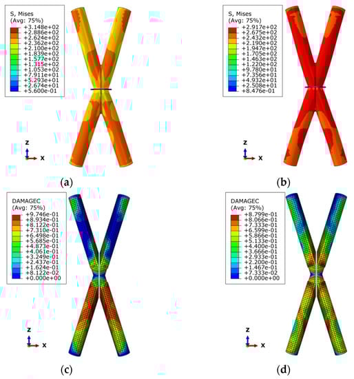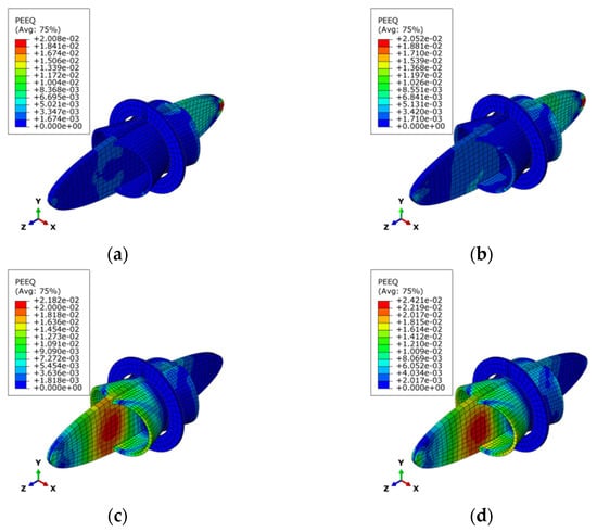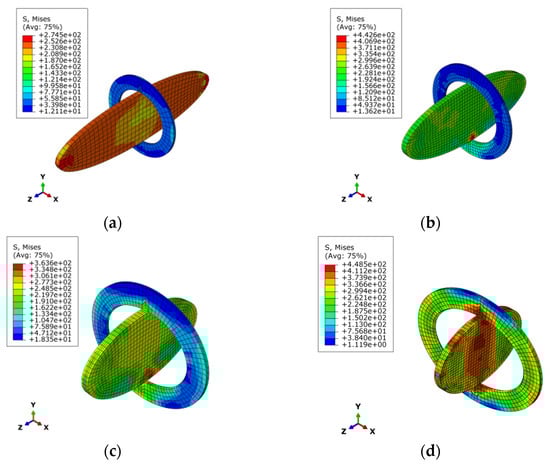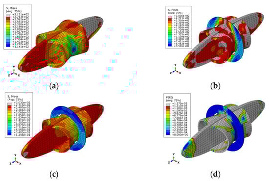 Von Mises stress and equivalent plastic strain: (a) stiffening ring thickness = 0 mm, (b) stiffening ring thickness = 5 mm, (c) stiffening ring thickness = 5 mm (PEEQ), and (d) stiffening ring thickness = 10 mm.