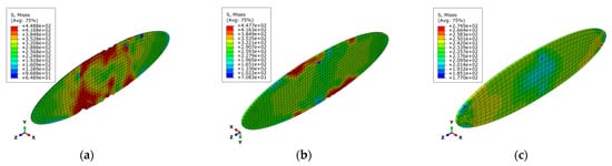 Von Mises stress nephogram: (a) thickness of connecting plate = 5 mm, (b) thickness of connecting plate = 20 mm, and (c) thickness of connecting plate = 28 mm.