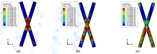 Nephogram of concrete compression damage: (a) thickness of connecting plate = 5 mm, (b) thickness of connecting plate = 20 mm, and (c) thickness of connecting plate = 28 mm.