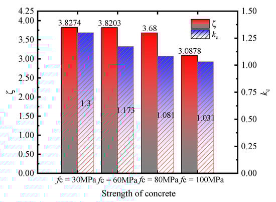 Figure 9d shows the displacement–lateral displacement diagram of specimen groups with different concrete strengths. The lateral displacement of specimens with higher concrete strengths fluctuates greatly, while the lateral displacement of specimens with 30 MPa strengths develops slowly. The first reason is that its ultimate load is small, and the specimen will be destroyed without large lateral deformation. The second reason is that concrete with lower strength has better ductility. The axial displacement corresponding to the initial lateral displacement of the specimen with the strength of 100 MPa is only 6.0 mm, which is earlier than that of the other specimens, which is also caused by the high brittleness of the concrete inside and the lack of constraints on the concrete members.