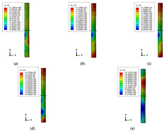 Figure 17 shows the lateral displacement nephogram of the recycled aggregate replacement rate specimen group. It can be seen from the figure that when the replacement rate is 0, the main failure mode of the specimen is steel pipe buckling failure, and the buckling location is the node of the lower extremity steel pipe and the middle of the lower extremity non-node steel pipe. The samples with a replacement rate of 30%, 50%, and 70% also showed drum failure. Except for the same drum failure position as those with a replacement rate of 0, large drum failures occurred at the upper and lower column feet. However, the drum failure sequence of the above components was a non-node zone followed by a node zone, so it can be considered that the specimens met the failure criterion of “non-node zone is destroyed before node zone”. The failure modes of the specimen with a 100% replacement rate are buckling failure and lateral instability failure, and the shape of the specimen after failure is close to a reverse “S” type. It shows that the replacement rate of recycled aggregate has an influence on the failure position and failure mode of members, and the lateral stiffness of members with a 100% replacement rate is insufficient, so it is not recommended in engineering practice.